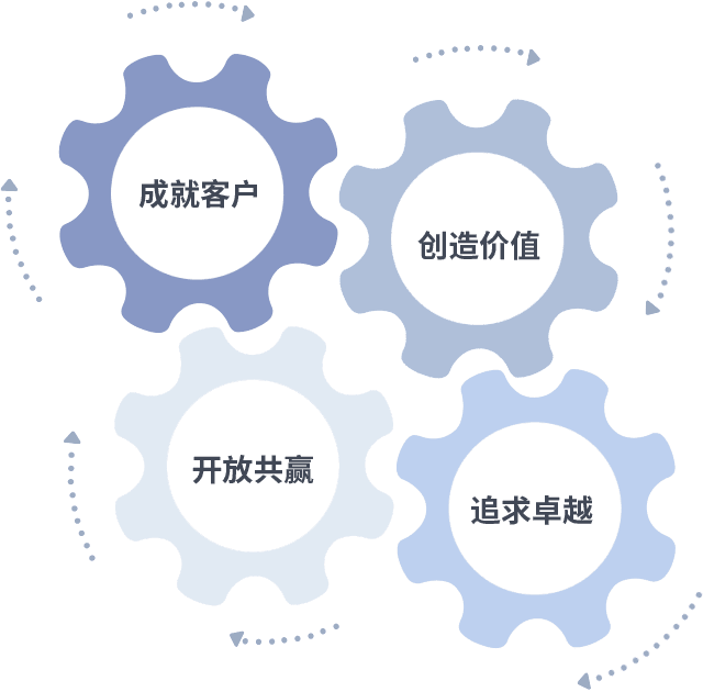 成就客户是一切决策的出发点,,创造价值是衡量所有工作的标准,,追求卓越是我们做事做人的态度,,,,开放共赢是我们的格局也是最终的结果。。。价值观的齿轮环环相扣,,推动着组织里的每个人不断向前。。